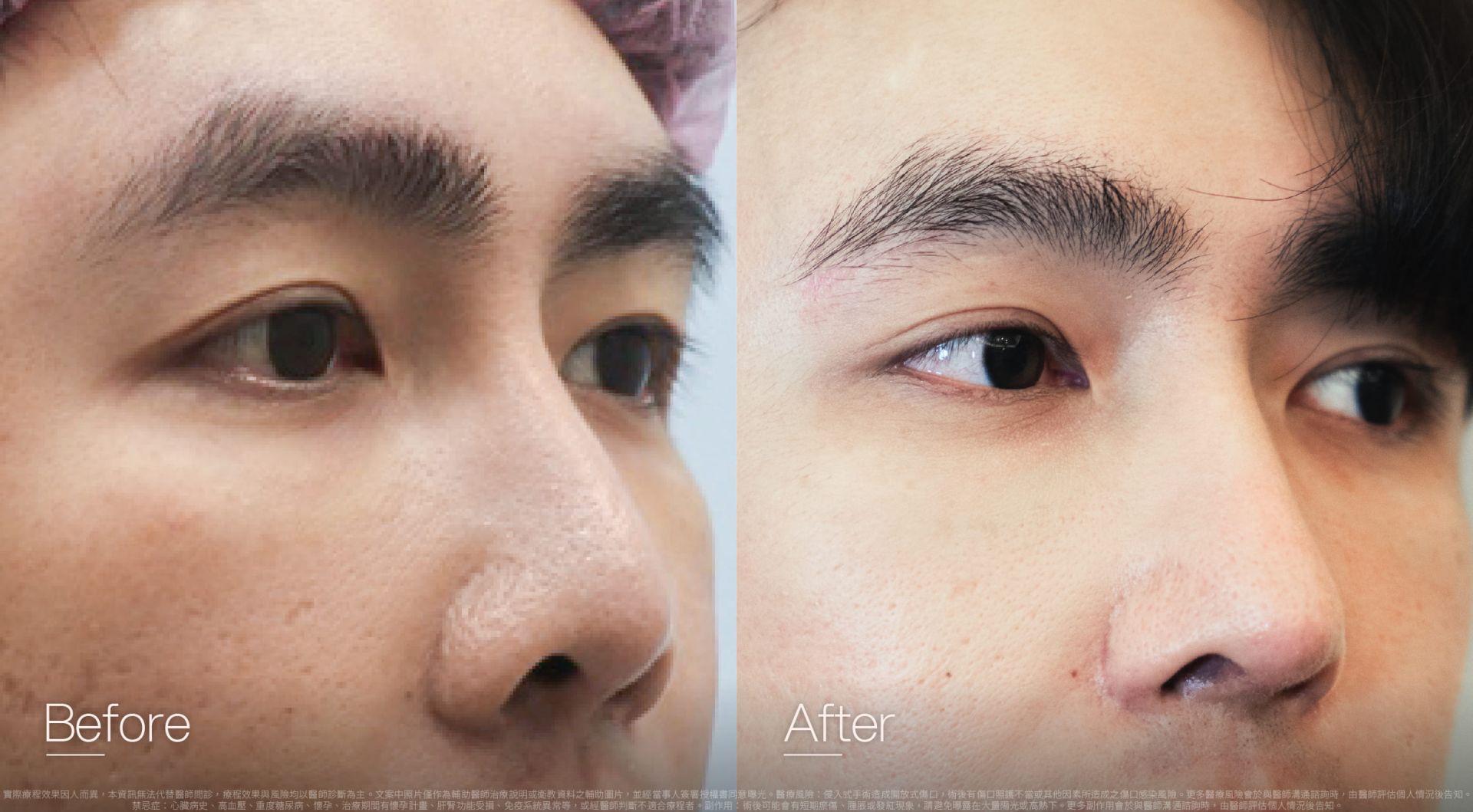 【眼部手術可能發生的副作用】:眼睛異物感或流淚、眼瞼外翻或雙眼不對稱之一時性現象、傷口感染、疤痕增生色素沉澱等情況。